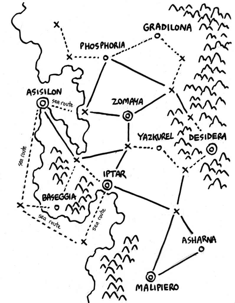 Asisilon (the biggest city in Amadis), “city of poets,” is a beautiful port city of baroque wood and stone houses, interspersed with gardens and parks. Every morning, fog from the sea blankets the city, but it usually retreats by noon. It is a trading city, and the harbor is always crowded with foreign merchant ships with colorful sails. Seven hills dominate the city: Fin Hill, Garden Hill, Silk Hill, Spoon Hill, Parrot Hill, Temple Hill and Gold Hill. The great Poetry Competition of Asisilon draws visitors from many lands. The people are well-regarded, though when their temper is aroused, they sometimes execute criminals in a mob attack with shards of pottery and broken coffee mugs.