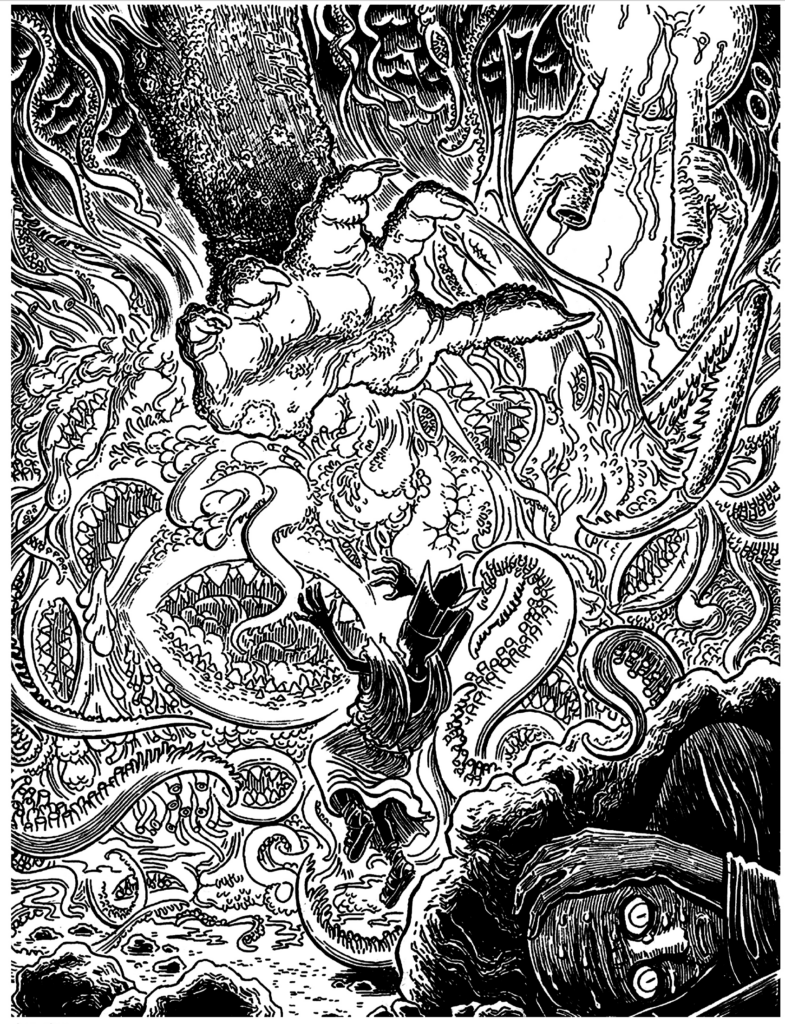 The archetypal Other Gods or Old Ones or ancient lore, Nightmares of Loathing are the most likely to have a monstrous physical form. Squirming masses of tentacles and wormlike tails, gigantic insects that leave a trail of hungry spawn in their wake, blind eyeless giants with greedy mouthes and the claws of savage beasts…these are the shapes of Loathing. But Loathing can also be something as subtle as an unearthly color that mutates and feeds on living beings, or a beautiful idol that drives those who see it to madness. Whatever their shape, they leave behind nothing but a trail of mangled corpses and entire landscapes reshaped into revolting corruption.